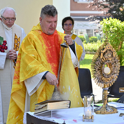 Erstkommunion, Firmung, Fronleichnam erhalten durch die An­wesenheit und Mit­wirkung von Vereinen besonderen Feier-Status: Da spielt dann die Marktmusik­kapelle am Kirch­platz auf, da werden in der Agape Brot und Wein gereicht, da beginnen die Kinder in der Park­anlage um den Pfarrhof zu spielen. – Schade nur, dass der Herr Pfarrer sich dem fröh­lichen Feiern bald ent­ziehen muss, weil er zur Sonntags­messe in die nächste Pfarr­verbands­pfarrkirche gerufen wird.